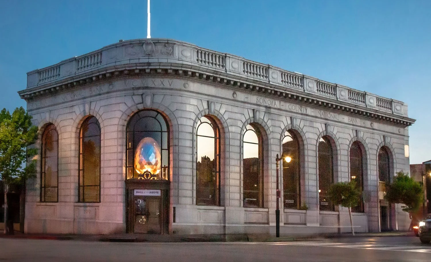 Hall of the Above occupies an iconic early 20th-century bank building at 199 Petaluma Blvd N — a landmark that instantly lends character and gravitas to any event.